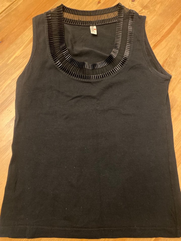 Siyah yaka detaylı , kolsuz ve tek renk, parlak detaylı kayık yaka kadın bluz. Gotik tarzda şık ve modern görünüme sahip.
