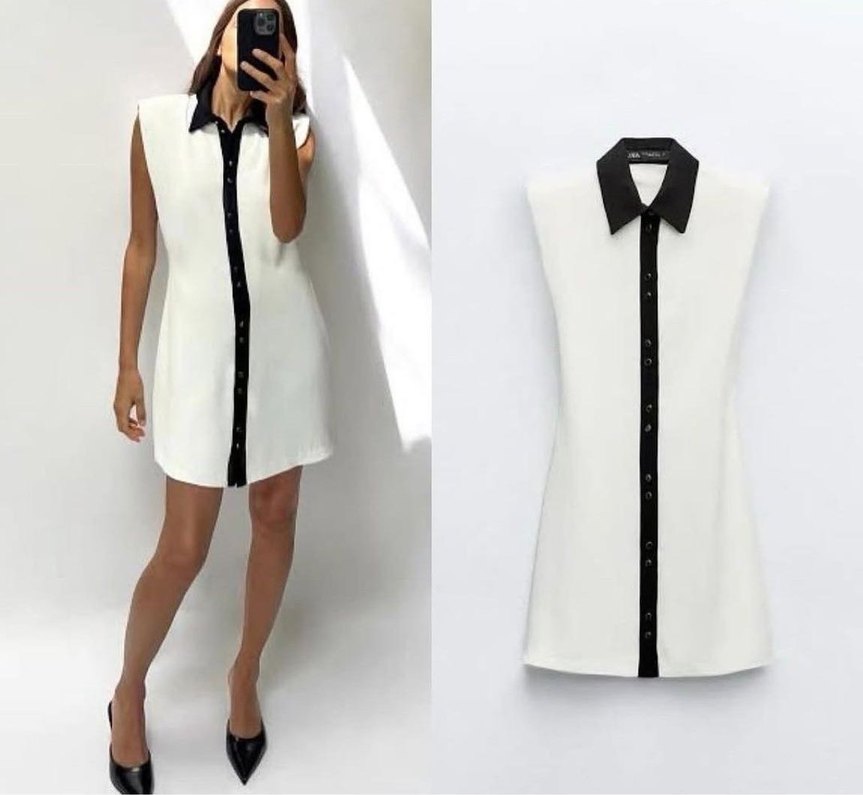 Siyah yakalı ve düğmeli beyaz mini elbise, düz ve hafif parlak sentetik kumaştan üretilmiştir. Ofis ve gündelik kullanıma uygundur.