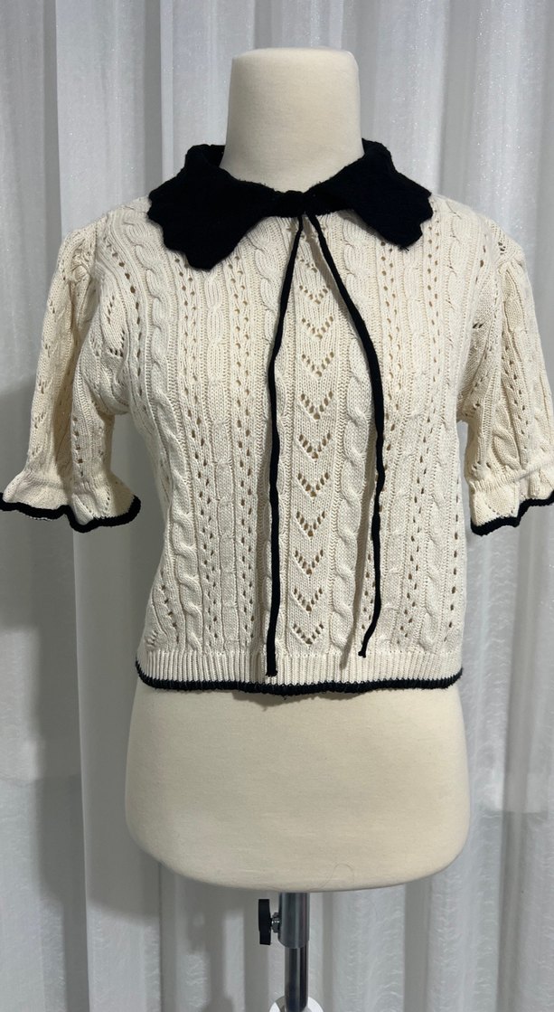 Siyah Yakalı Beyaz Örgü Kısa Kollu Kazak