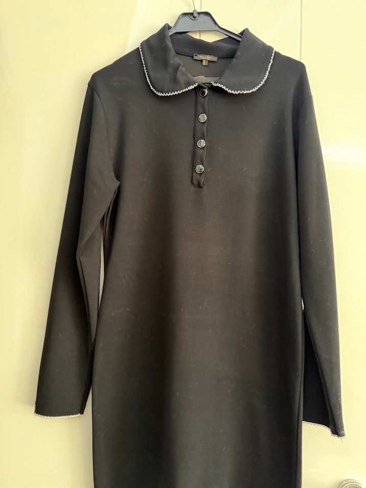 Siyah triko elbise, yakalı ve düğmeli detaylara sahip uzun kolludur. Rahat kesim ve midi boyda, yumuşak sentetik kumaştan üretilmiştir, ofis için uygundur.