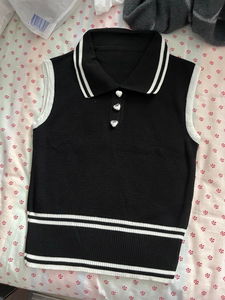 Siyah, yakalı ve düğmeleri kalp şeklinde olan örgü, kolsuz, vücuda oturan midi uzunlukta kadın süveter. Beyaz çizgili detaylar içerir.