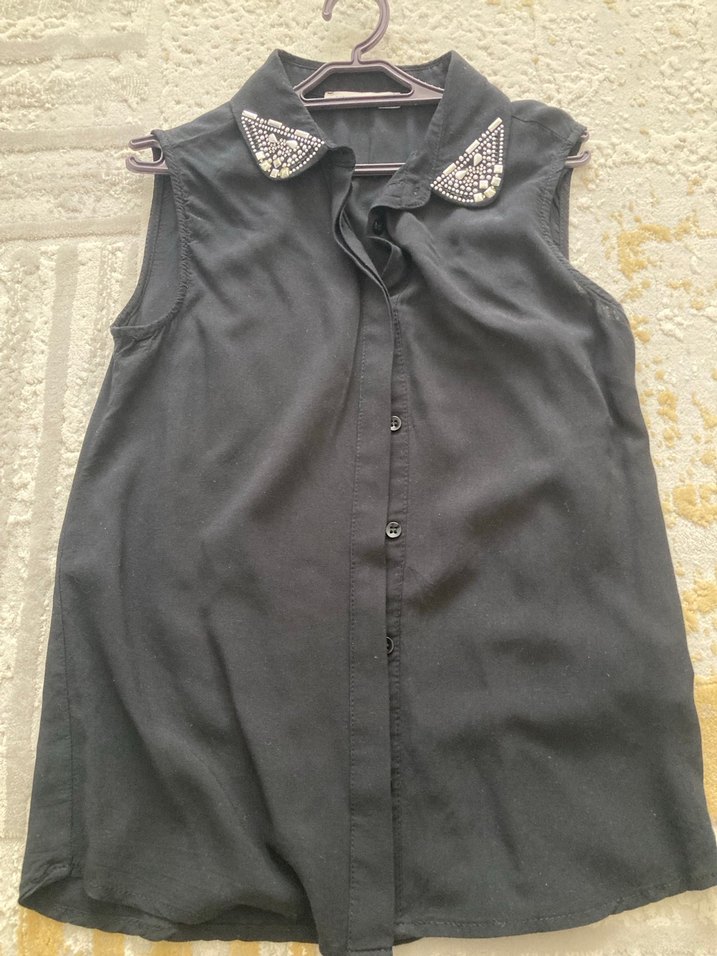 Kolsuz siyah gömlek, yakasında taş detayları bulunur.