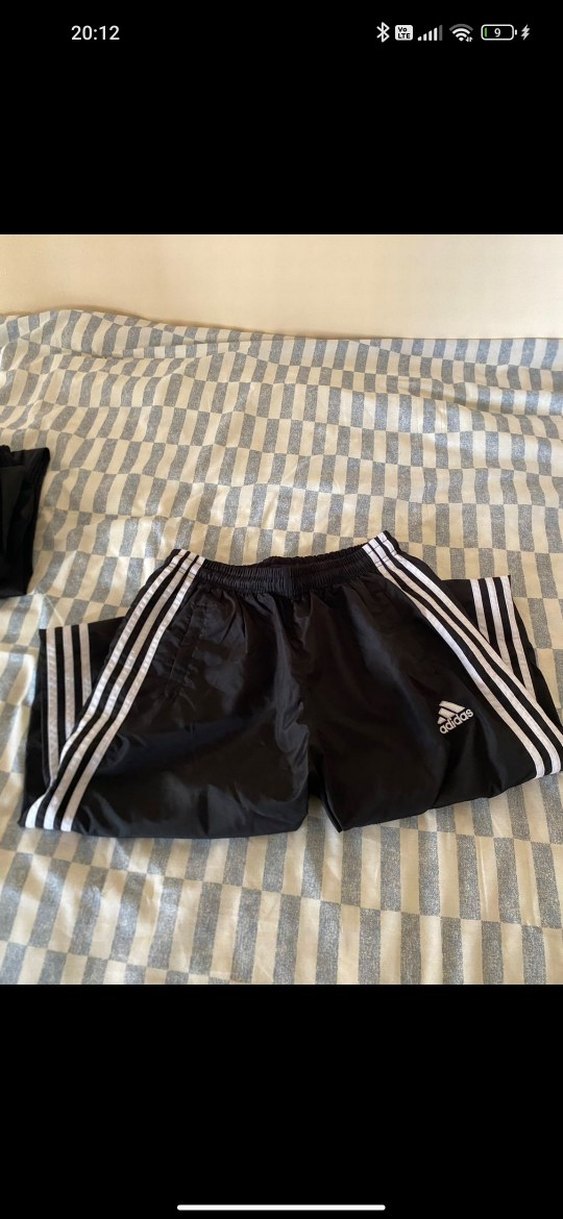 Siyah renkte, yanları beyaz şeritli, bol kesim erkek eşofman altı. Pileli detaylara sahip, yumuşak sentetik kumaştan üretilmiştir.