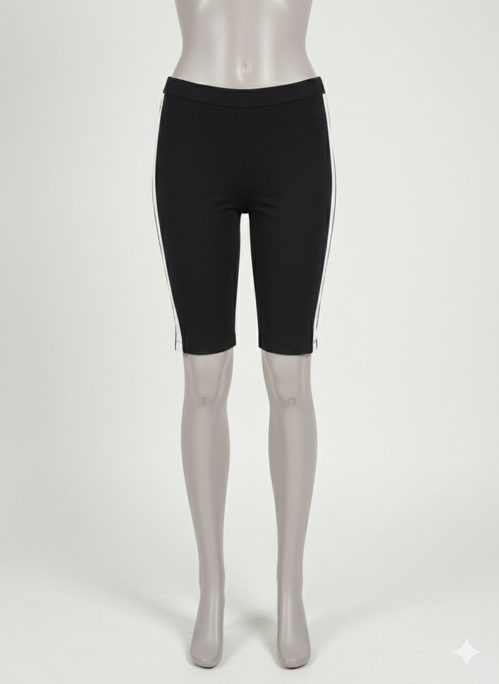 Yanları gri şeritli, düz siyah mini biker şort, rahat ve şık sentetik kumaştan üretilmiştir. ️