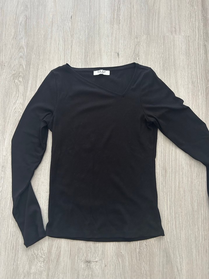 Siyah yandan V yaka, uzun kollu, vücuda oturan, midi uzunlukta, yumuşak sentetik kumaştan yapılmış bluz. Minimalist ve desensiz, günlük kullanım için uygundur. Oxxo marka s beden