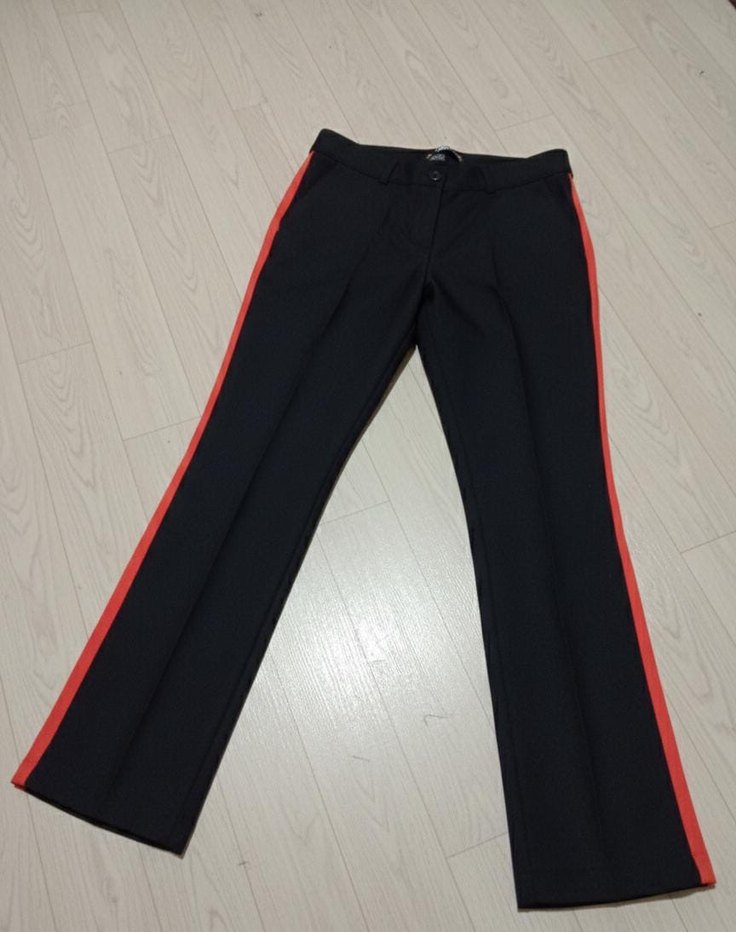 Düzenli kesim, elastik detaylı siyah kadın kumaş pantolon. Kırmızı yan şeritli, ofis ve günlük sokak tarzına uygun.