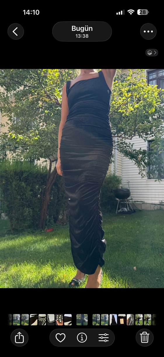 Siyah, drapeli ve uzun kesime sahip bu elbise, geniş kare yaka ve iaskılarla tamamlanmıştır. İpeksi dokusuyla gotik tarzda dış mekan kullanımı için uygundur. Arkası yırtmaçlıdır.Sıfır üründür,etiketi üstünde İsteyene ayakkabıyı da satışa koydum.