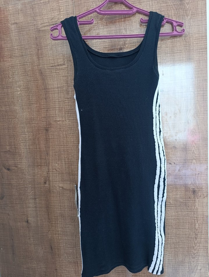 Siyah renkli, yanları beyaz çizgili, elastik kumaşlı, kolsuz ve midi boy spor elbise günlük kullanıma uygun s beden fakat l bedene kadar oluyor denendi kumaşı esnek 1-2 defa giyildi defosu lekesi yok