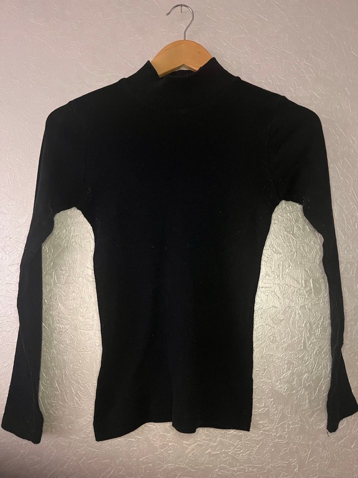 Yarım balıkçı yaka ve uzun kollu, vücuda oturan siyah kadın kazağı.