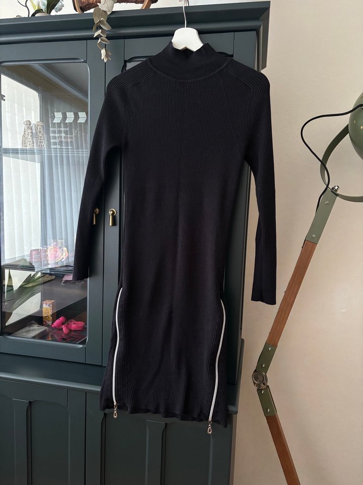 Rengi düz siyah. Fotoğrafta ışık parlaması sebebiyle dalgalı çıkmış ancak bir sorunu yok. Dar kesim mini elbise, yarım balıkçı yaka ve uzun kolludur. Pürüzsüz triko kumaştan yapılmış olup, her iki yan tarafında fermuar detayları bulunur. Günlük sokak stili için uygundur.