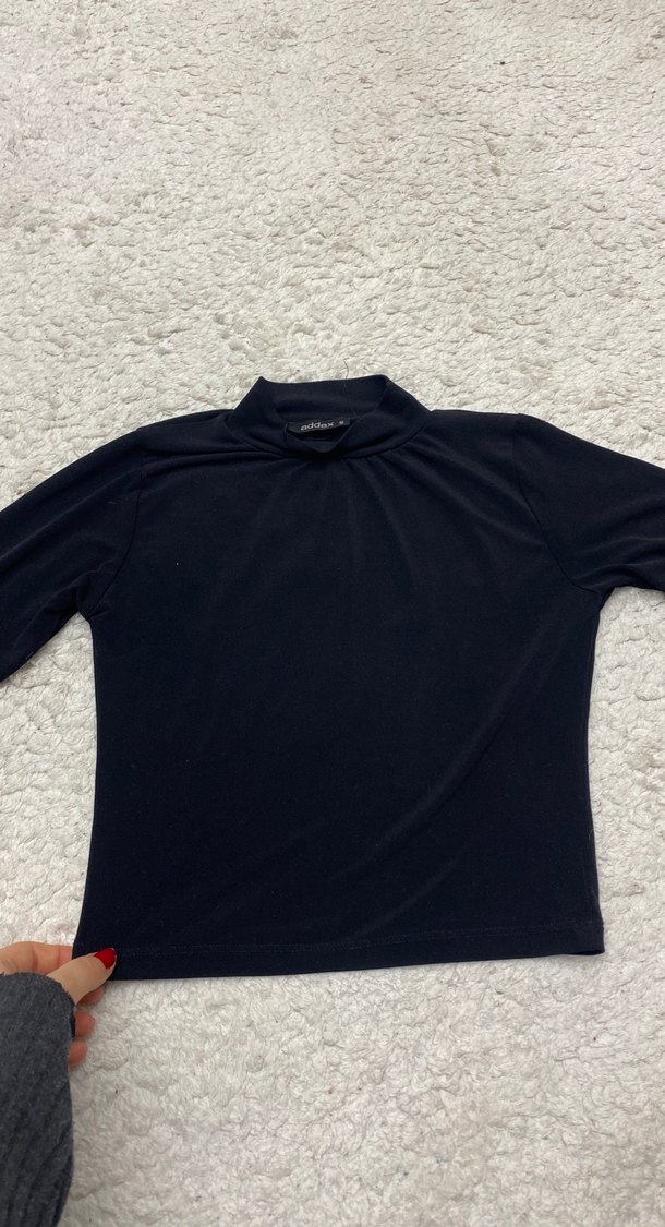 Siyah renkli, yüksek yakalı ve uzun kollu, vücuda oturan kesime sahip kadın tişörtü. Yumuşak ve sıcak kumaştan, günlük kullanım için uygun sade bir sokak stili.