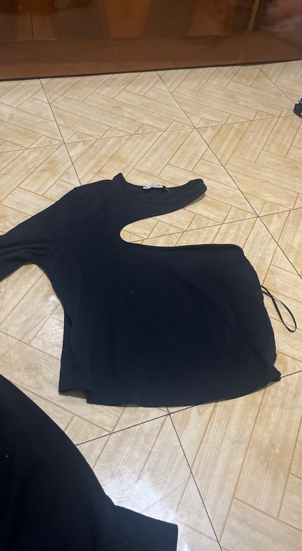 Siyah, uzun kollu, yarım boğazlı ve yırtmaçlı kısa tek kol Sentetik kumaştan, dış mekan için uygun.