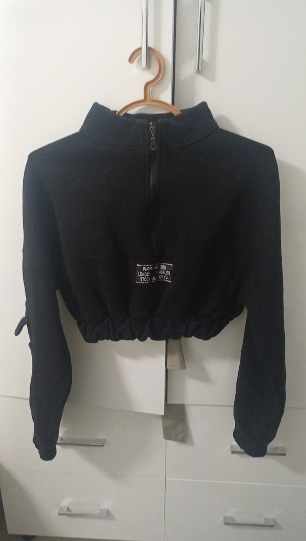 Yarım fermuarlı, uzun kollu, yüksek yakalı siyah sweatshirt. Yumuşak ve sıcak kumaştan, kısa boy ve elastik bel detaylıdır. Trendy athleisure tarz için uygundur. on yazıda silinmeler var.