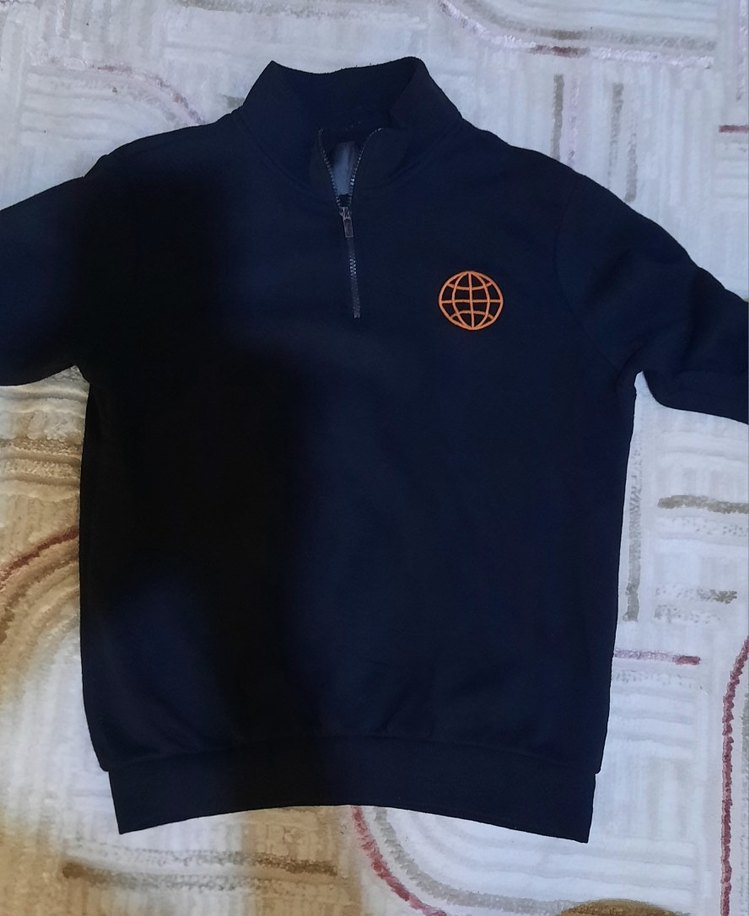 Yarım fermuarlı, uzun kollu, bol kesim erkek sweatshirt. Siyah yumuşak kumaş üzerinde turuncu baskılı dünya deseni bulunur. Günlük sokak stili için uygundur.