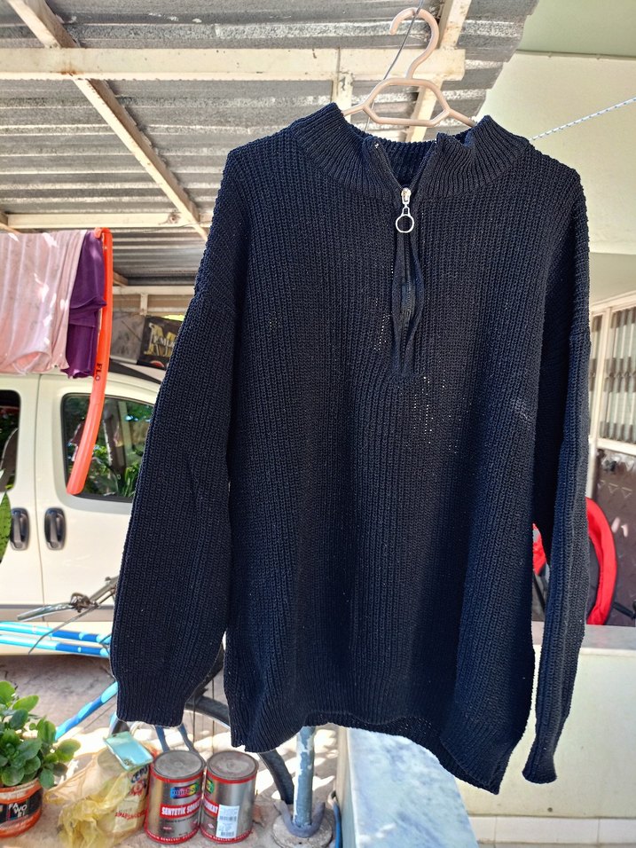 Siyah renkte, yarım fermuarlı yüksek yakalı, uzun kollu, bol kesim örgü triko kazak. Günlük ve rahat sokak stili için uygundur.