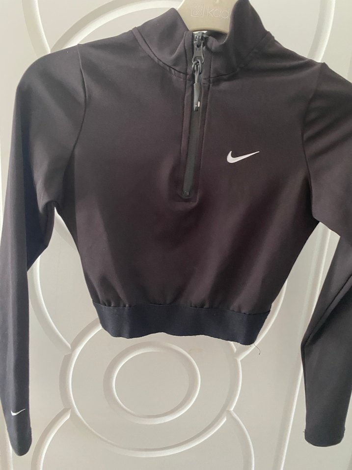 Siyah, yarım fermuarlı, uzun kollu, yüksek yakalı, kısa kesim, sentetik kumaştan kadın spor sweatshirtü.