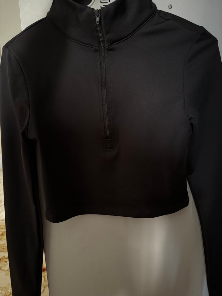 Bu siyah crop top, yüksek yakalı ve uzun kolludur. Vücuda oturan kesimi, ön fermuarı ve pürüzsüz sentetik kumaşıyla gündelik sokak stiline uygundur.