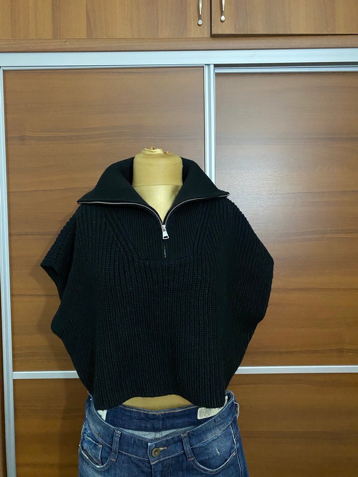 Yarım fermuarlı yüksek yakalı, kolsuz siyah örgü kazak. Salaş kesim ve kısa boyuyla günlük sokak modası için uygun.