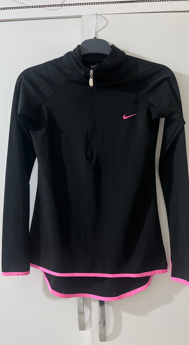 Kızlar için uzun kollu, yüksek yakalı ve yarım fermuarlı siyah sweatshirt. Pembe detaylarla sade ve şık, sentetik kumaştan üretilmiştir.