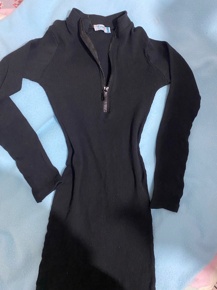 Siyah, yarım fermuarlı, uzun kollu, midi boy triko elbise. Sıcak ve yumuşak dokusu günlük kullanım için uygundur.