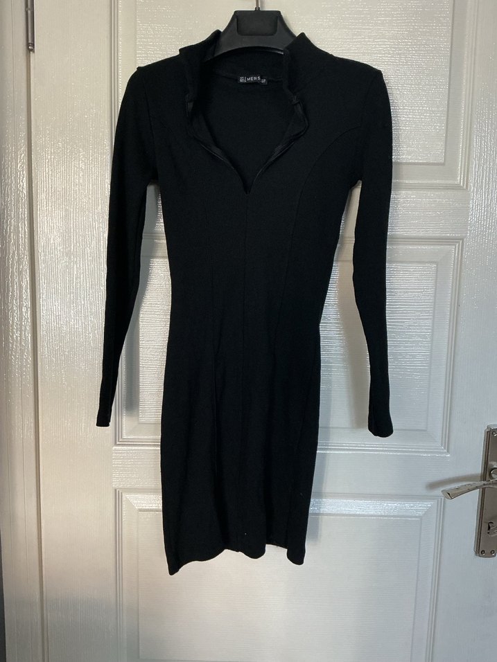 Siyah, uzun kollu, yüksek yakalı ve yarım fermuarlı triko elbise. Midi boyda, yumuşak sentetik kumaştan üretilmiştir.