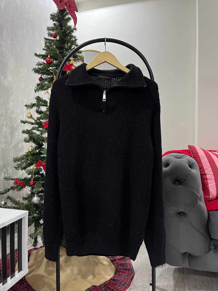 Siyah Yarım Fermuarlı Yüksek Yakalı Triko Kazak
