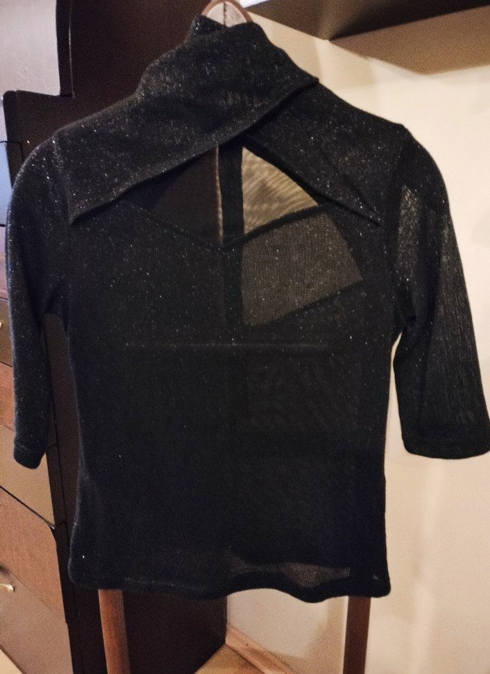 Parlak triko, boğazlı ve yarım kollu, vücuda oturan siyah bluz. Normal boyda, yırtmaçlı, gotik tarzda parti için uygun.ürün sayılı kullanıldı. ürünüdür. hiçbiri kusuru yoktur. ince bir trikodur. ön kısmı göğüs transparan, sırt kısmı fermuarlı ve transparan. esnek bir triko.ayrica boyun detayı çok hoş yarım balıkçı duruyor. göğüs ölçüsü 42cm. 10 cm daha esniyor. boy 57cm. #simli #transparan #dekolte #siyah #balıkçı #koton #bershka #ipejyol #roman #zara #mango