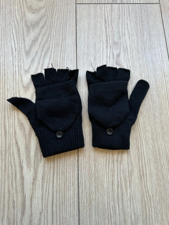 Siyah örgü yarım parmak eldivenler, yumuşak ve sıcak astarlı, düğme detayıyla sade goth tarzına uygun. ürünü 1 kez kullandım görseldeki gibidir almadan önce mesaj atınız