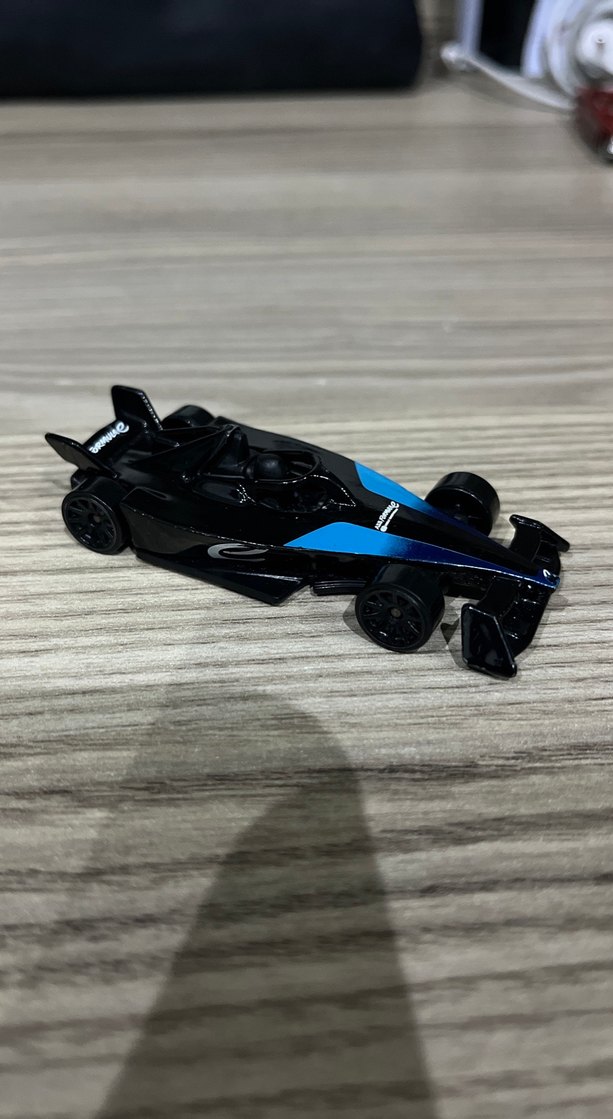 Siyah renkli, mavi detaylı yarış oyuncak arabası, oyun ve koleksiyon için uygundur.