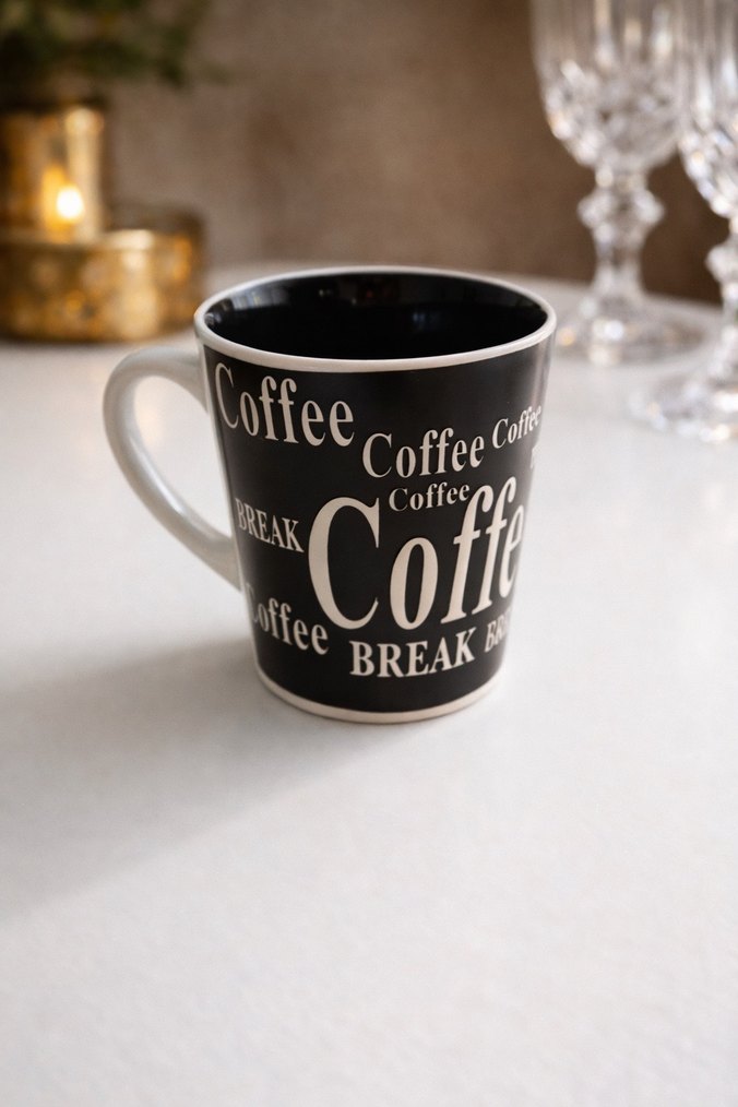 Üzerinde 'Coffee' ve 'Break' yazıları bulunan siyah kahve kupası. ☕ Hediye geldi hiç kullanmadım