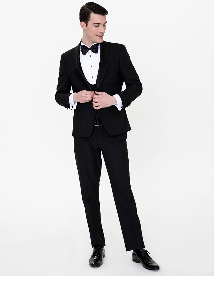 Pierre Cardin marka Siyah yelekli damatlık smokin .Slim fit şal yaka model , poliester -yün karışımı kumaş , Boy 6 ,Beden 48 . Kusursuz hasarsızdır . Siyah Papyon ve bel kuşak seti de yanında verilecektir . (Gömlek dahil değildir)