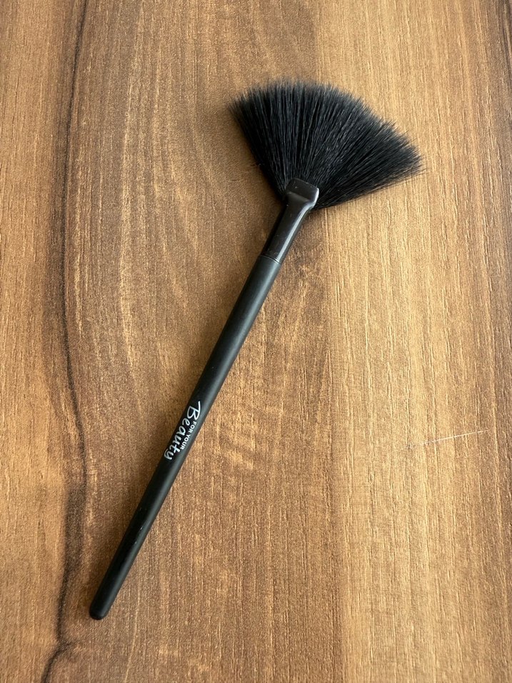 Yumuşak kıllara ve şık sap yapısına sahip siyah yelpaze makyaj fırçası, hassas makyaj uygulamaları için uygundur. ️