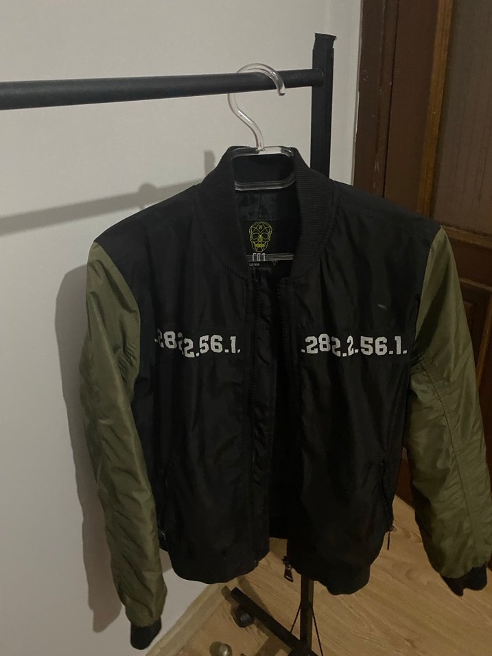 Siyah ve yeşil renklerde, baskılı ve fermuarlı, bol kesim uzun kollu erkek ceket. Sentetik kumaştan, günlük kullanıma uygun.