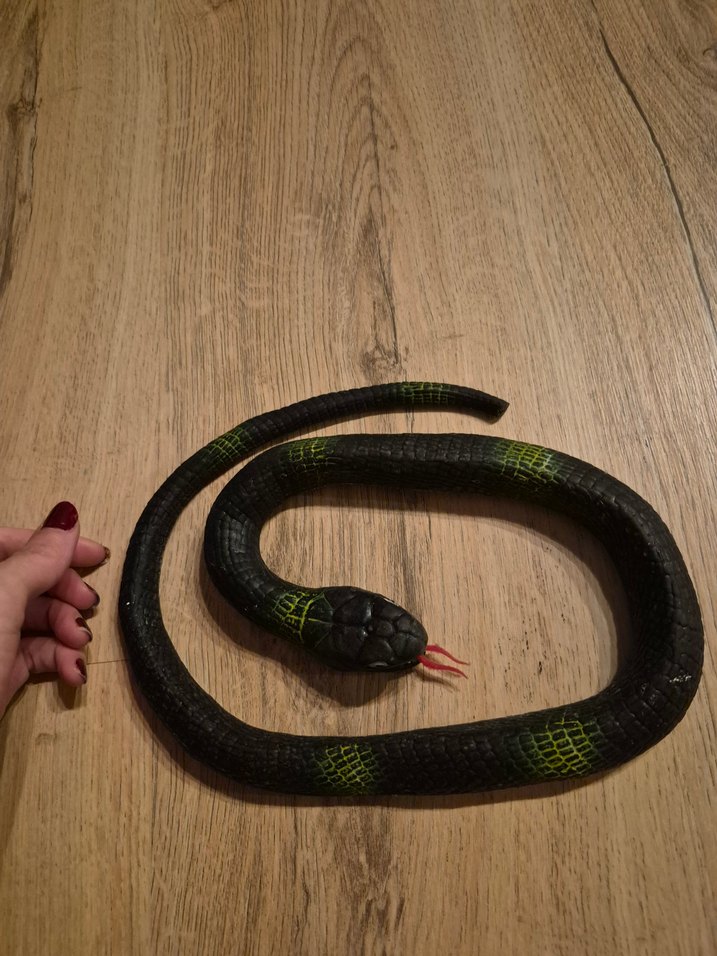 dokusu esnek yumuşak. kuyrugu kopmuş bi kısmı . Kıvrılmış tasarımlı, dokulu yüzeye ve kırmızı çatallı dile sahip siyah-yeşil yılan figürü.