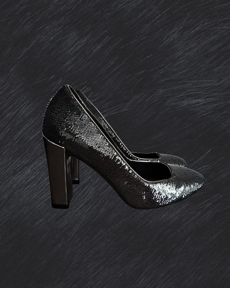 Siyah yılan baskılı, tok topuklu ve tokalı kadın stiletto. Gotik tarzı klasik zarafetle buluşturarak ofis kullanımı için uygun.