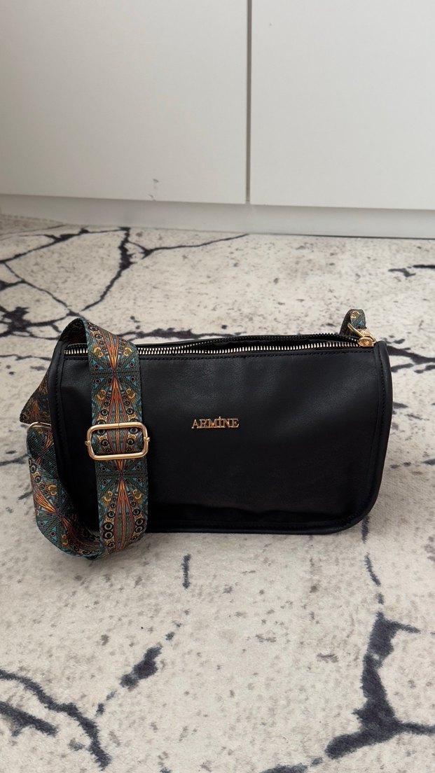 Siyah yılan derisi desenli deri kadın çantası, renkli kemerli askısıyla bohem ve sokak stiline uyum sağlar. Hiç kullanılmadı sadece etiketi yoktur.