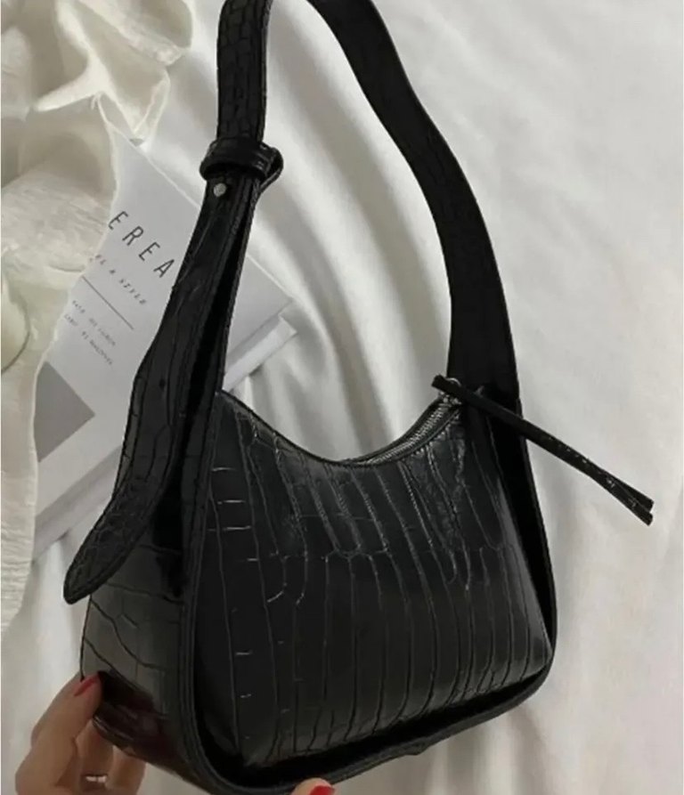 Siyah deriden yapılmış, koyu yılan derisi desenli ve tokalı askılı kadın çantası, günlük kullanıma uygundur.