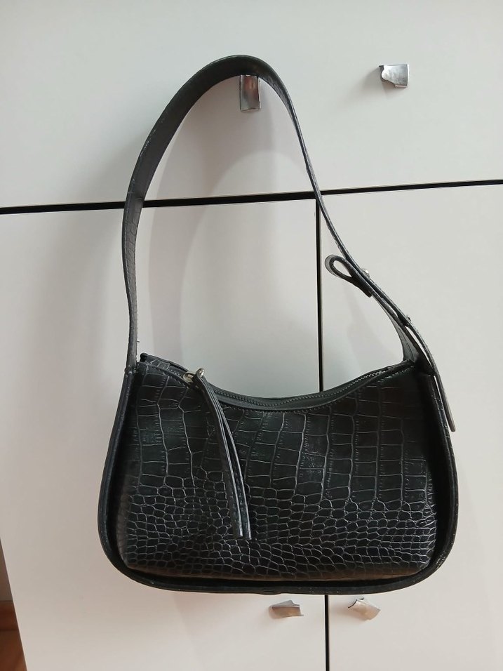 Siyah yılan derisi desenli deri kadın çantası, tokalı askıya sahiptir. Minimalist ve klasik tarz için uygundur, günlük kullanıma idealdir.