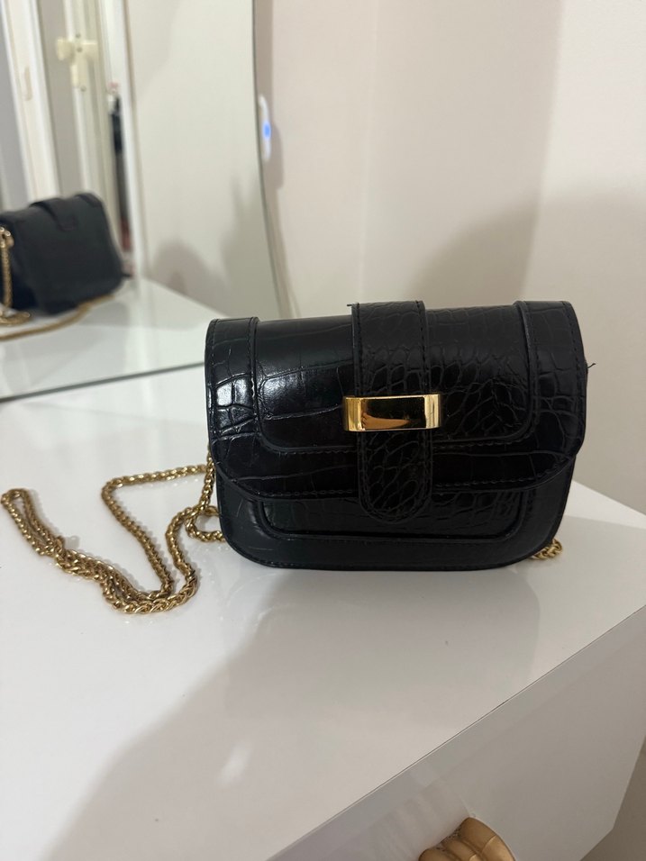 Siyah yılan derisi desenli deri kadın çantası, tokalı kapama ve altın renk zincir askıya sahiptir. Modern klasik ve Paris esintili, günlük kullanıma uygun.