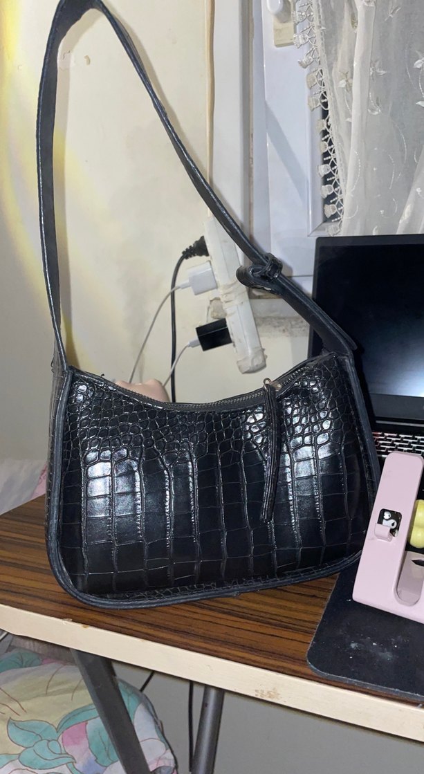 Siyah yılan derisi desenli, deri kadın çanta, tokalı detaylarla günlük sokak stiline uygun.