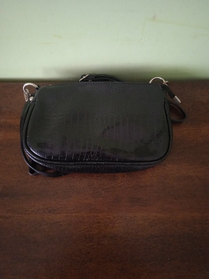 Siyah yılan derisi desenli deri kadın çanta, tokalı detaylarıyla minimalist gotik tarzı yansıtır. Günlük kullanıma uygun koyu ve şık bir modeldir.