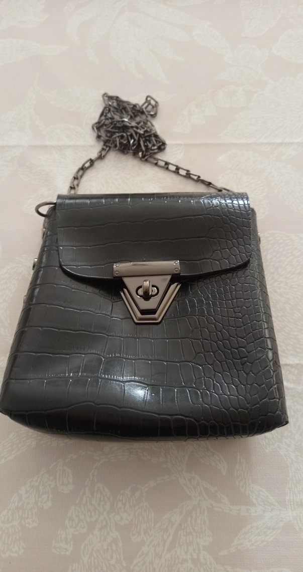 siyah yılan derisi desenli deri kadın çantası, tokalı kapak ve zincir askıya sahiptir. Günlük kullanım için trend ve gotik stil uygundur.