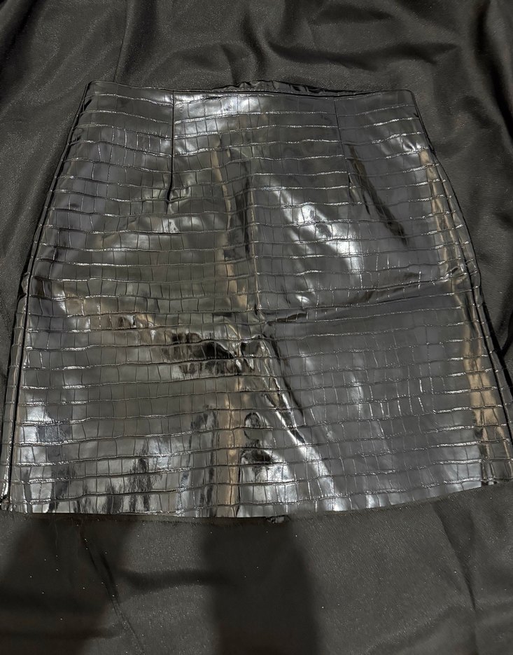 Siyah Yılan Derisi Desenli Deri Mini Etek