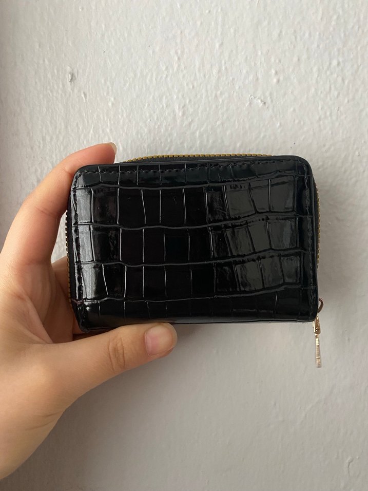 Siyah yılan derisi desenli, fermuarlı deri cüzdan, günlük kullanıma uygun, trend sokak stiliyle uyumlu.