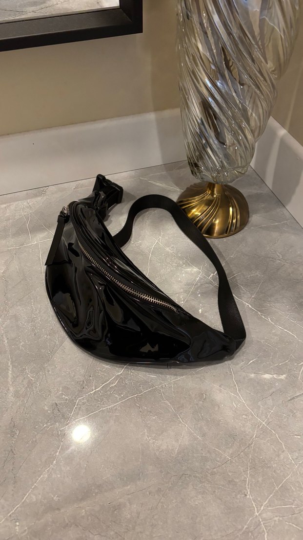 Siyah deri çapraz çanta, tokalı kayış ve yılan derisi desenine sahip, avangart tarz için uygun.