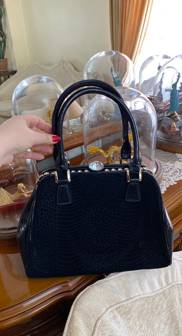 Siyah yılan derisi desenli deri çanta, tokalı kulplara sahip. Klasik şıklık sunar, özel günleriniz için ideal.