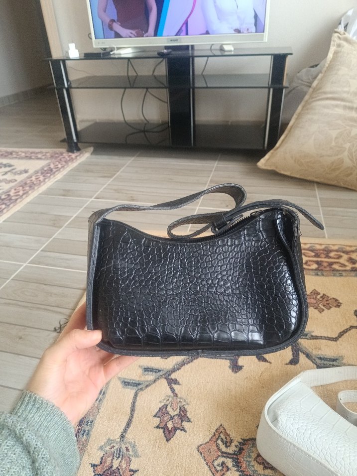 Siyah deri, yılan derisi desenli ve tokalı kadın çantası, günlük ve sokak modası için uygun.
