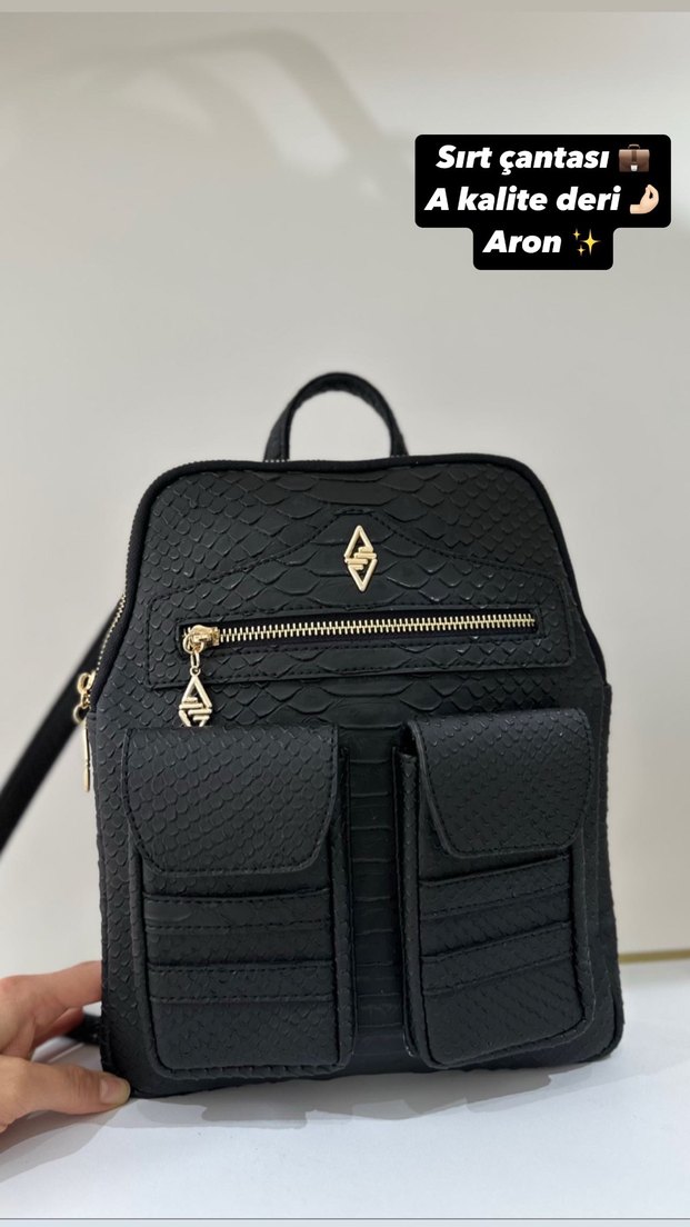 Siyah yılan derisi desenli, fermuarlı cepleri olan, günlük kullanıma uygun sokak stili kadın deri sırt çantası.
