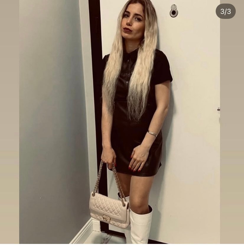 Parlak siyah deri ve yılan derisi desenli, kısa kollu, yüksek yakalı, vücuda oturan mini elbise. Günlük kullanıma uygun goth tarzı.