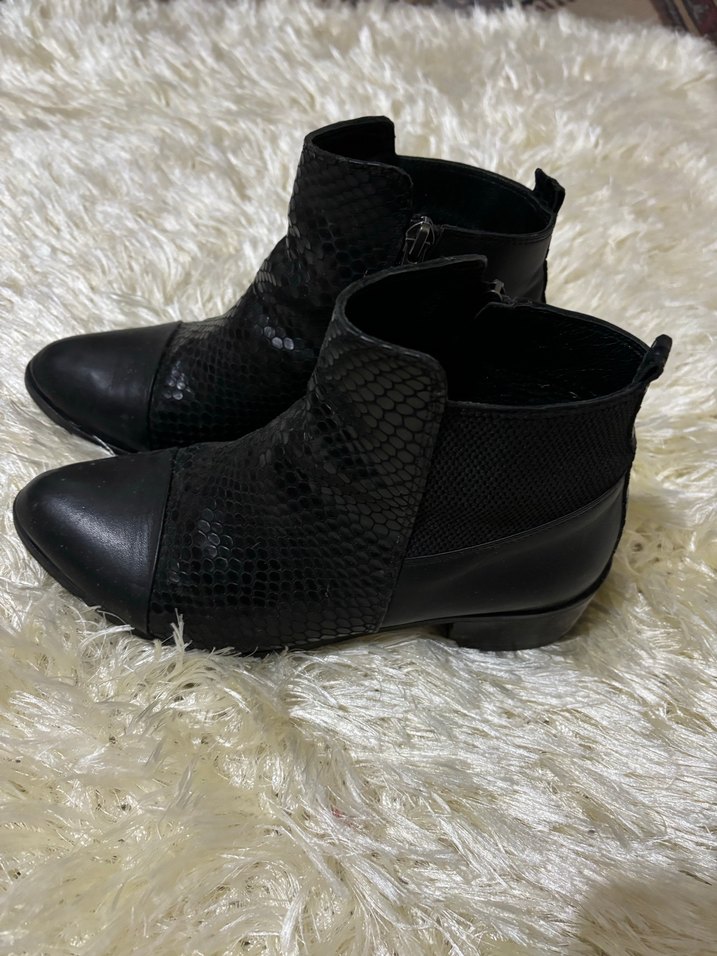 Siyah yılan derisi desenli ve kürk detaylı kadın botları, blok topuklu. Günlük kullanıma uygun, trend goth tarzında.
